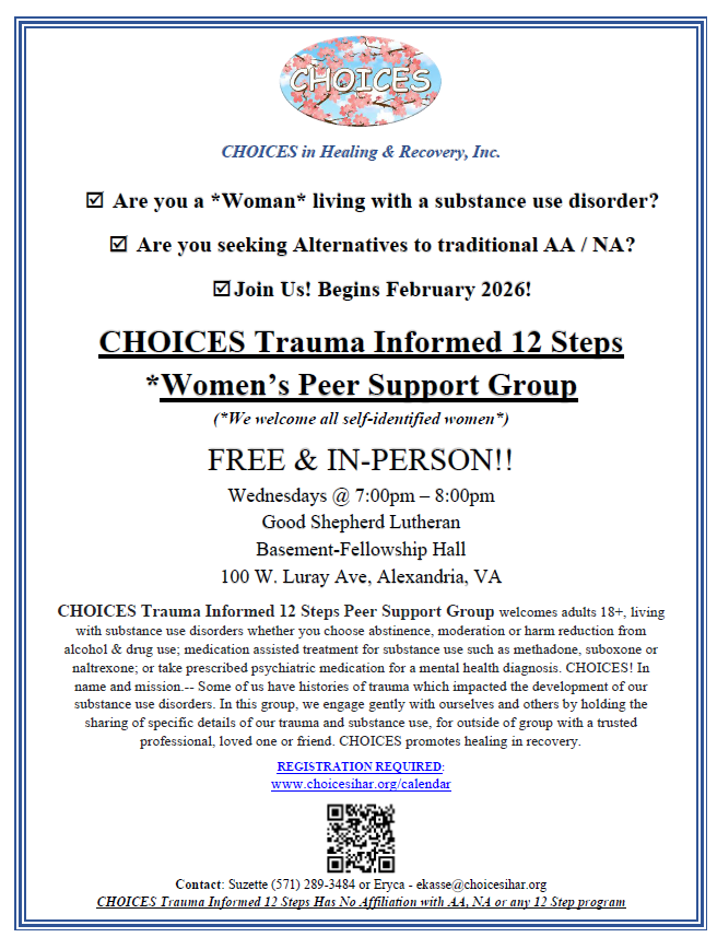 2026 SCHEDULE: CHOICES Trauma Informed 12 Steps Peer Support Groups