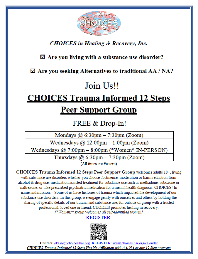 The CHOICES Trauma Informed 12 Steps Peer Support Group welcomes adults 18+, living with substance use disorders whether you choose abstinence, moderation or harm reduction from alcohol & drug use; medication assisted treatment for substance use such as methadone, suboxone or naltrexone; or take prescribed psychiatric medication for a mental health diagnosis. CHOICES! In name and mission.